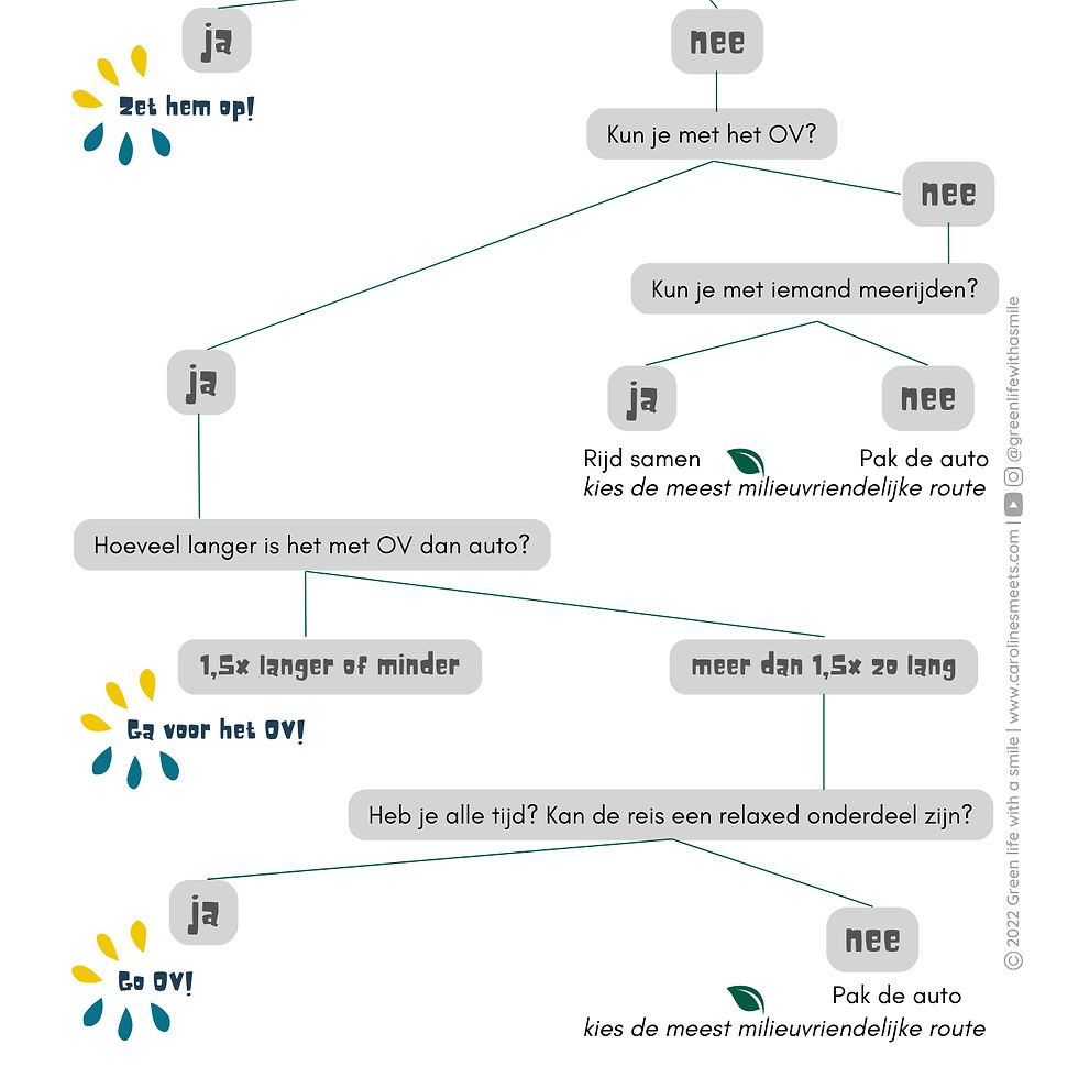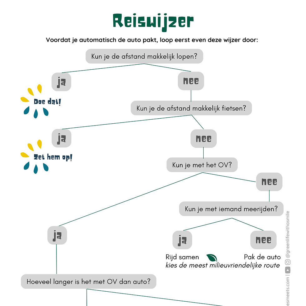 Deze reiswijzer is een beslisboom om je bewust te maken van je reisgedrag. Door even stil te staan hoe je je wil verplaatsen, ben je bewuster bezig met het vervoermiddel dat je gaat gebruiken. Zelf heb ik ook gemerkt dat ik na het beantwoorden van de vragen niet persé uitkom op de auto terwijl ik dat van te voren wel aannam. Zo is deze tool ook ontstaan. Omdat we heel makkelijk de auto pakken en ik mij op een gegeven moment bedacht dat we dit tripje ook wel met de trein hadden kunnen maken.